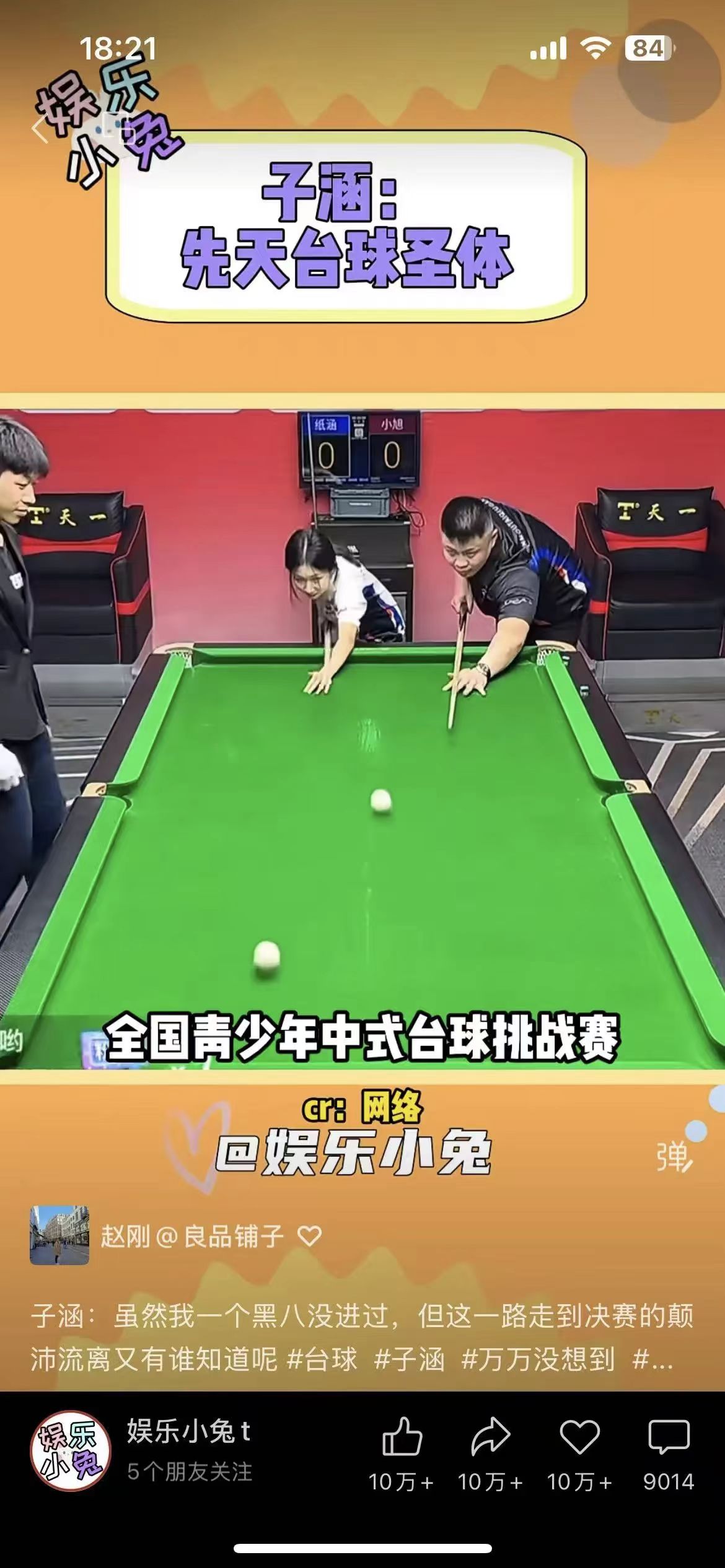 今年夏天,在全國青少年中式臺球挑戰(zhàn)賽中,一名叫子涵的選手,因為其獨特的運氣與臺球打法,而瞬間被引爆全網,這樣引爆了更多新的選手躍躍欲試,深度參與臺球娛樂的想法。