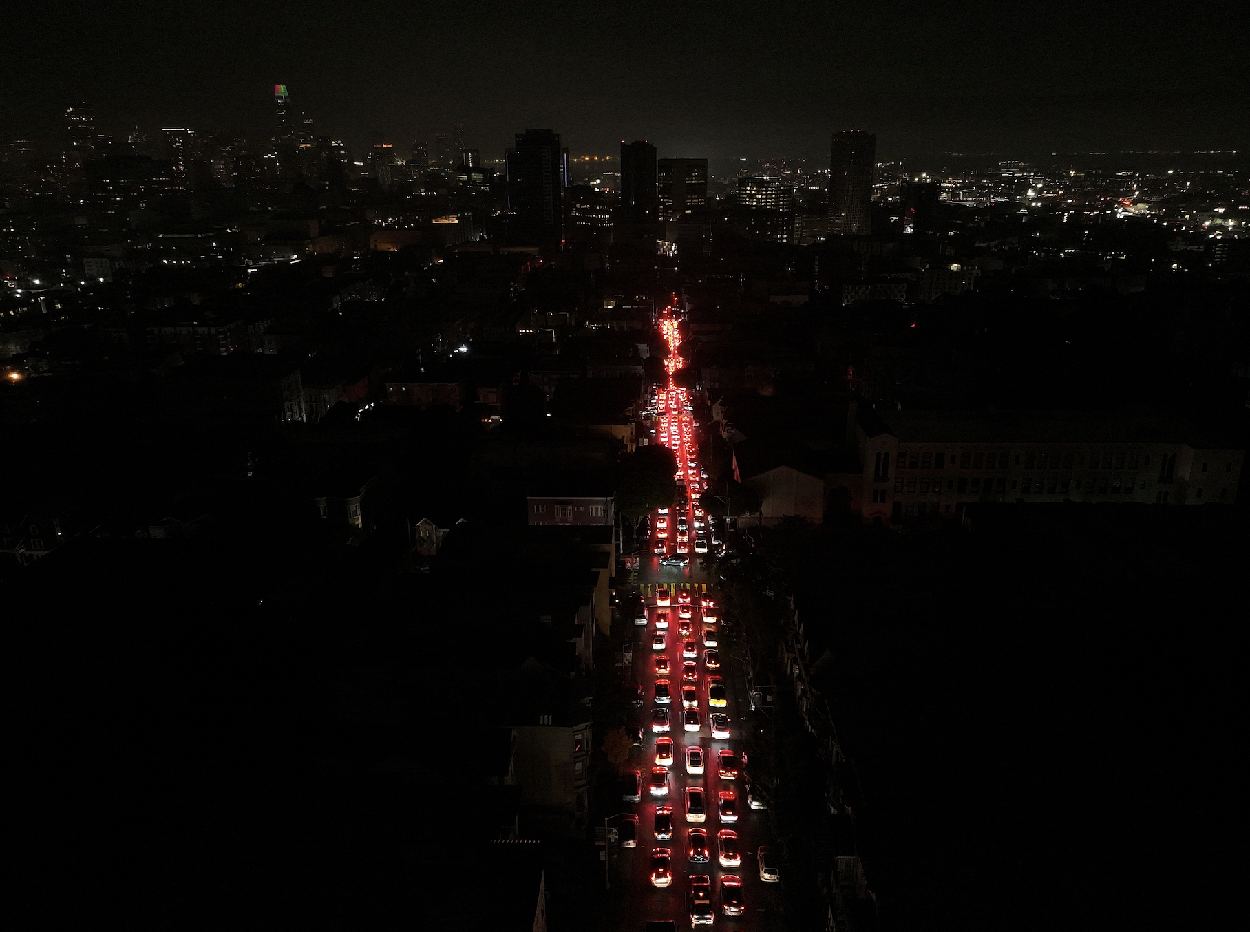 當?shù)貢r間2025年12月20日,美國加利福尼亞州舊金山,超過13萬戶太平洋煤電公司(PG&E)的用戶遭遇停電,交通擁堵。圖片來源:CFP