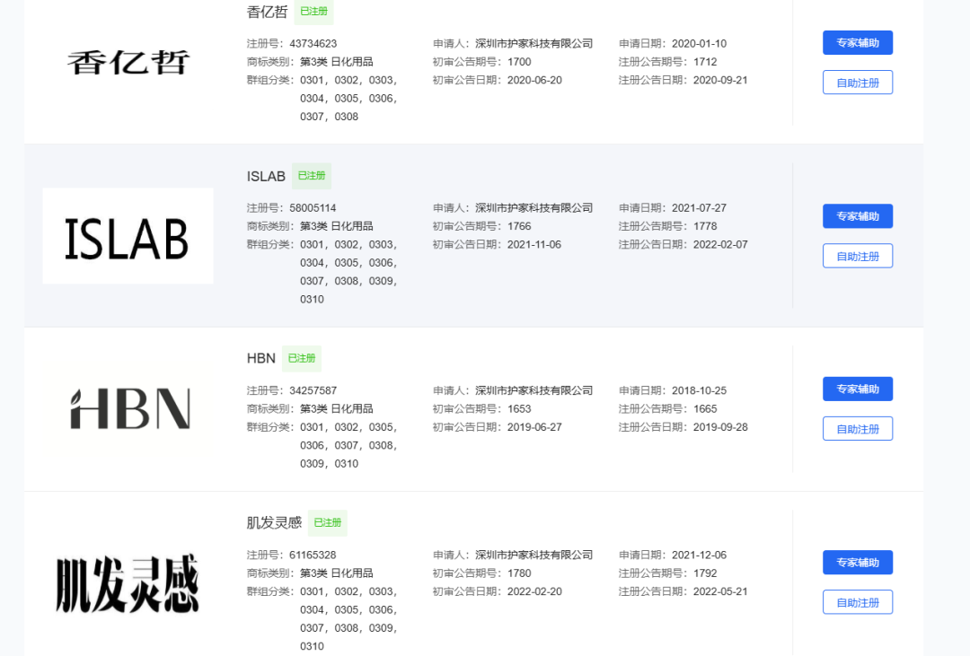 在一眾布局中,HBN母公司的動(dòng)向尤為值得注意。2025年,HBN母公司深圳市護(hù)家科技有限公司通過(guò)全資子公司杭州洛可馨生物科技,推出首個(gè)全新護(hù)膚品牌洛可馨LOCKSKIN。而據(jù)查詢,深圳市護(hù)家科技已悄然注冊(cè)了香藝哲、肌發(fā)靈感、HBN MEN等近20個(gè)商標(biāo),也就是說(shuō),其下一步或在香水、頭發(fā)護(hù)理、男士護(hù)膚等領(lǐng)域孵化全新品牌,足見(jiàn)其在品牌矩陣上的自信與野心。