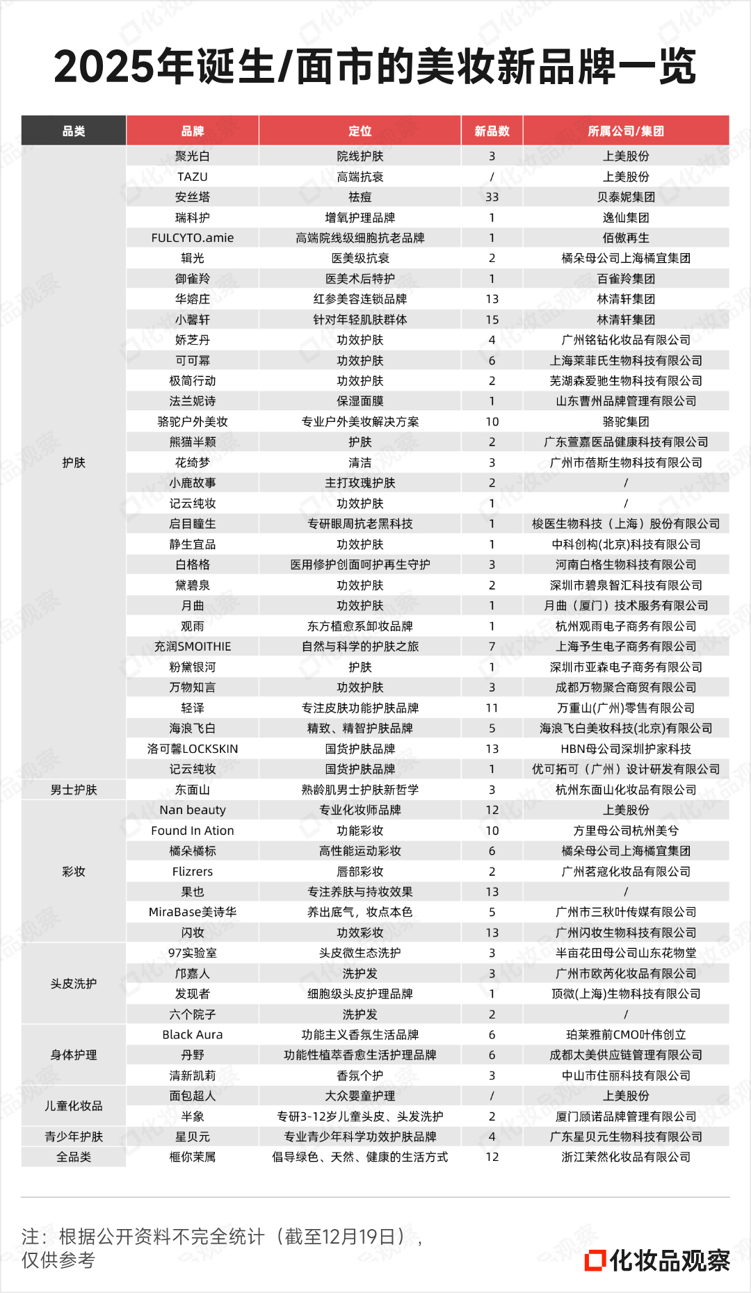 而另一邊,是新面孔的密集涌入。據(jù)《化妝品觀察》不完全統(tǒng)計(jì),僅今年誕生的新品牌就超50個(gè),上美股份、貝泰妮、百雀羚、林清軒等頭部集團(tuán)紛紛孵化新品牌,范圍覆蓋護(hù)膚、彩妝、頭皮洗護(hù)、身體護(hù)理及兒童化妝品等領(lǐng)域。