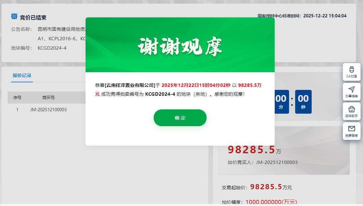 編號為KCGD2024-4號地塊,最終被云南建投旗下子公司云南祥澤置業(yè)有限公司底價約9.8億元收入囊中,單價為1550萬元/畝,成交樓面價約7500元/㎡。