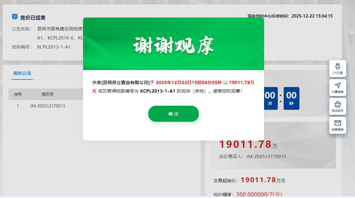 其中,編號為KCPL2013-1-A1號地塊,最終被邦泰集團旗下子公司昆明邦立置業(yè)有限公司底價約1.9億元摘得,單價為918萬元/畝,成交樓面價約5509元/㎡。