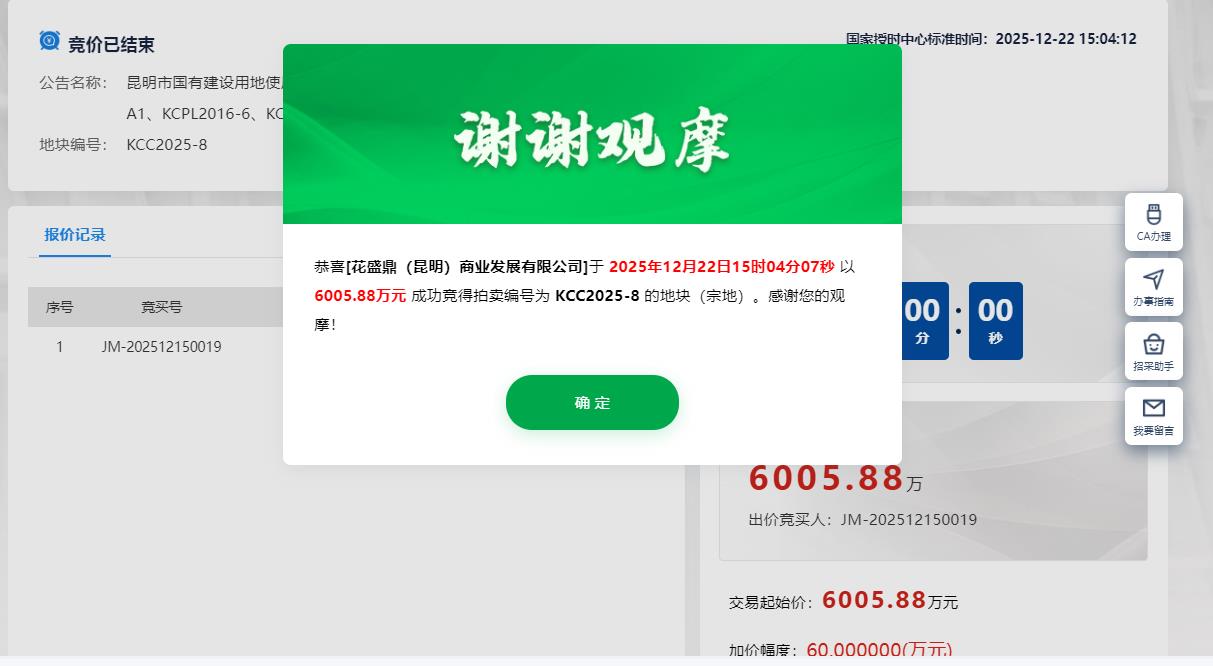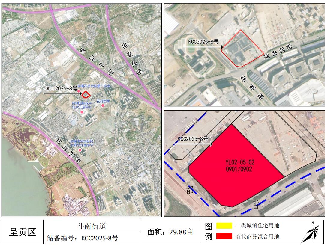 編號為KCC2025-8號地塊,為商業(yè)用地,最終被花盛鼎(昆明)商業(yè)發(fā)展有限公司底價6005.88萬元拿下,單價為201萬元/畝,成交樓面價約914元/㎡。