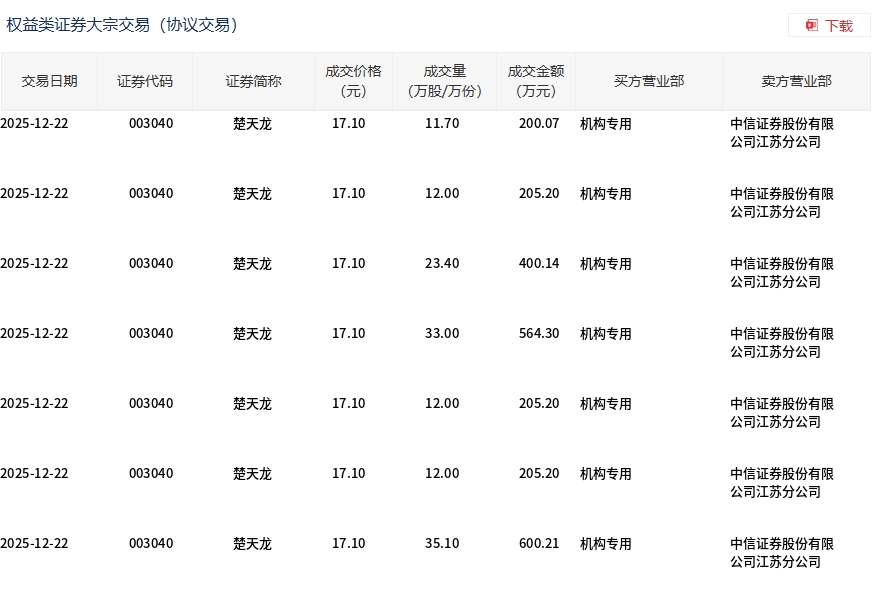12月22日,楚天龍大宗交易成交139.2萬(wàn)股,成交額2380.32萬(wàn)元,占當(dāng)日總成交額的2.13%,成交價(jià)17.1元,較市場(chǎng)收盤(pán)價(jià)19.59元折價(jià)12.71%。