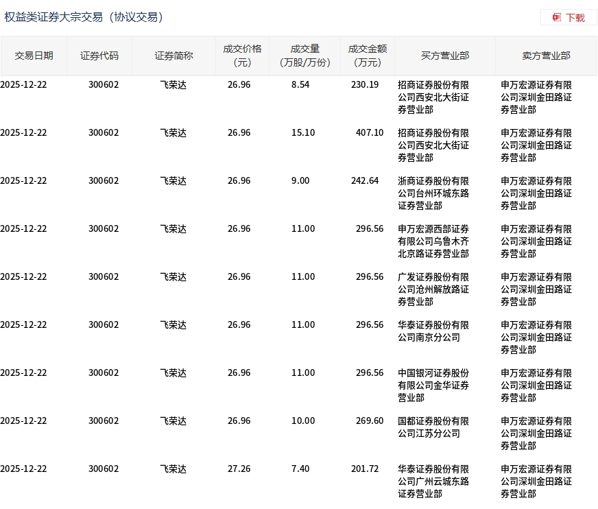 12月22日,飛榮達(dá)大宗交易成交94.04萬股,成交額2537.49萬元,占當(dāng)日總成交額的2.81%,成交均價(jià)26.98元,較市場收盤價(jià)30.02元折價(jià)10.12%,其中最高成交價(jià)27.26元,最低成交價(jià)26.96元。