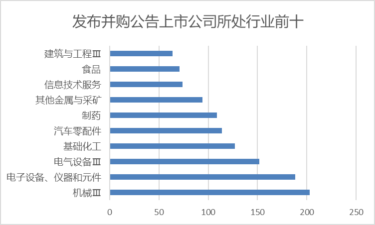 據界面新聞統(tǒng)計,從所處行業(yè)看,發(fā)布并購重整公告數量前十的企業(yè)所處行業(yè)依次為機械、電子設備、電氣設備、基礎化工、汽車零配件、制藥、金屬與采礦、信息技術服務、食品、建筑與工程。