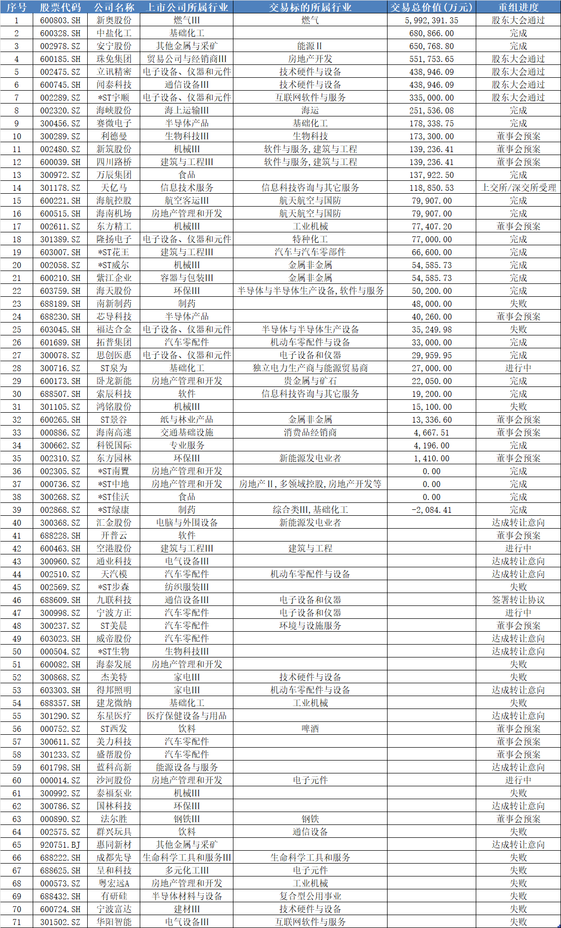 界面新聞統(tǒng)計梳理發(fā)現(xiàn),今年71樁重大并購重組案例中,有近半數為跨界并購,涉及能源、房地產、科技等多個領域,典型案例包括主營生態(tài)工程建設的*ST花王(603007.SH)作價6.66億元跨界收購汽車與汽車零部件企業(yè)尼威動力。還有十余家企業(yè)進行產業(yè)鏈資源整合型并購,包括新奧股份(600303.SH)子公司私有化新奧能源(02688.HK);主營釩鈦磁鐵礦采選等業(yè)務的安寧股份(SH688175)65億元收購經質礦產。
