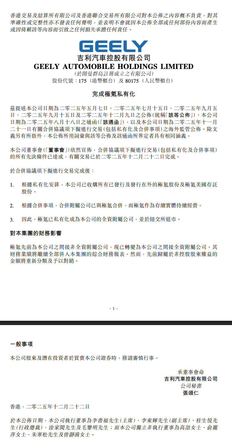 12月22日晚間,吉利汽車控股有限公司(00175.HK)發(fā)布公告,正式宣布已完成對極氪智能科技控股有限公司的私有化及合并交易。即日起,極氪成為吉利汽車的全資附屬公司,并從紐約證券交易所退市。這場始于今年5月的整合計劃,在歷時7個月后終于塵埃落定。