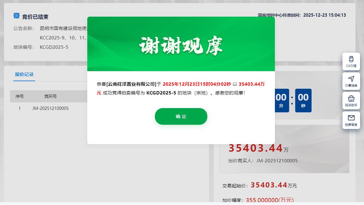 12月23日,昆明共計4宗約72.25畝地成功底價出讓,1宗地因無人報名而流拍,合計攬金約4.3億元。