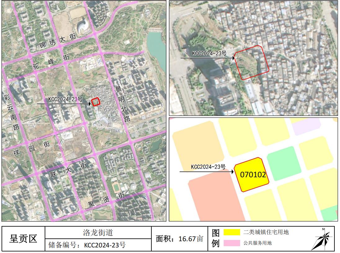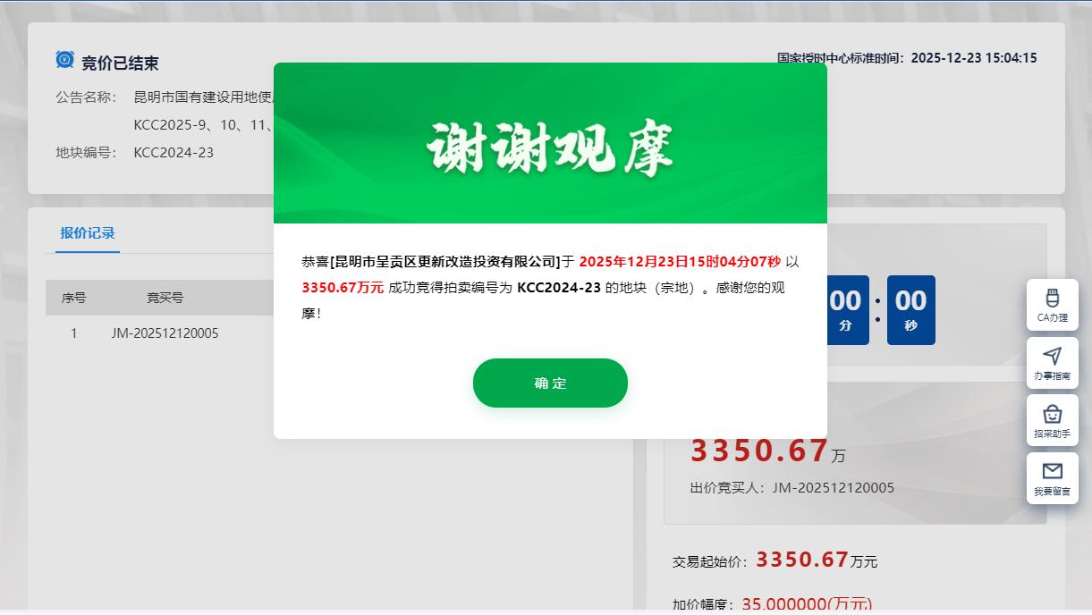 編號為KCC2024-23號地塊,最終被昆明市呈貢區(qū)更新改造投資有限公司旗下平臺公司昆明市呈貢區(qū)更新改造投資有限公司底價3350.67萬元摘得,成交樓面價約1077元/㎡,單價為201萬元/畝。