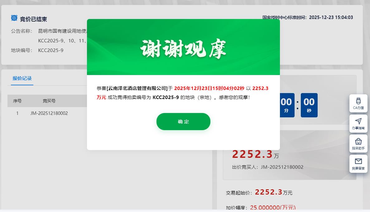 編號為KCC2025-9號地塊,最終被云南澤北酒店管理有限公司底價2252.3萬元 摘得,成交樓面價約866元/㎡,單價為202萬元/畝。