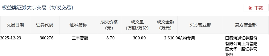三豐智能今日大宗交易折價成交300萬股,成交額2610萬元