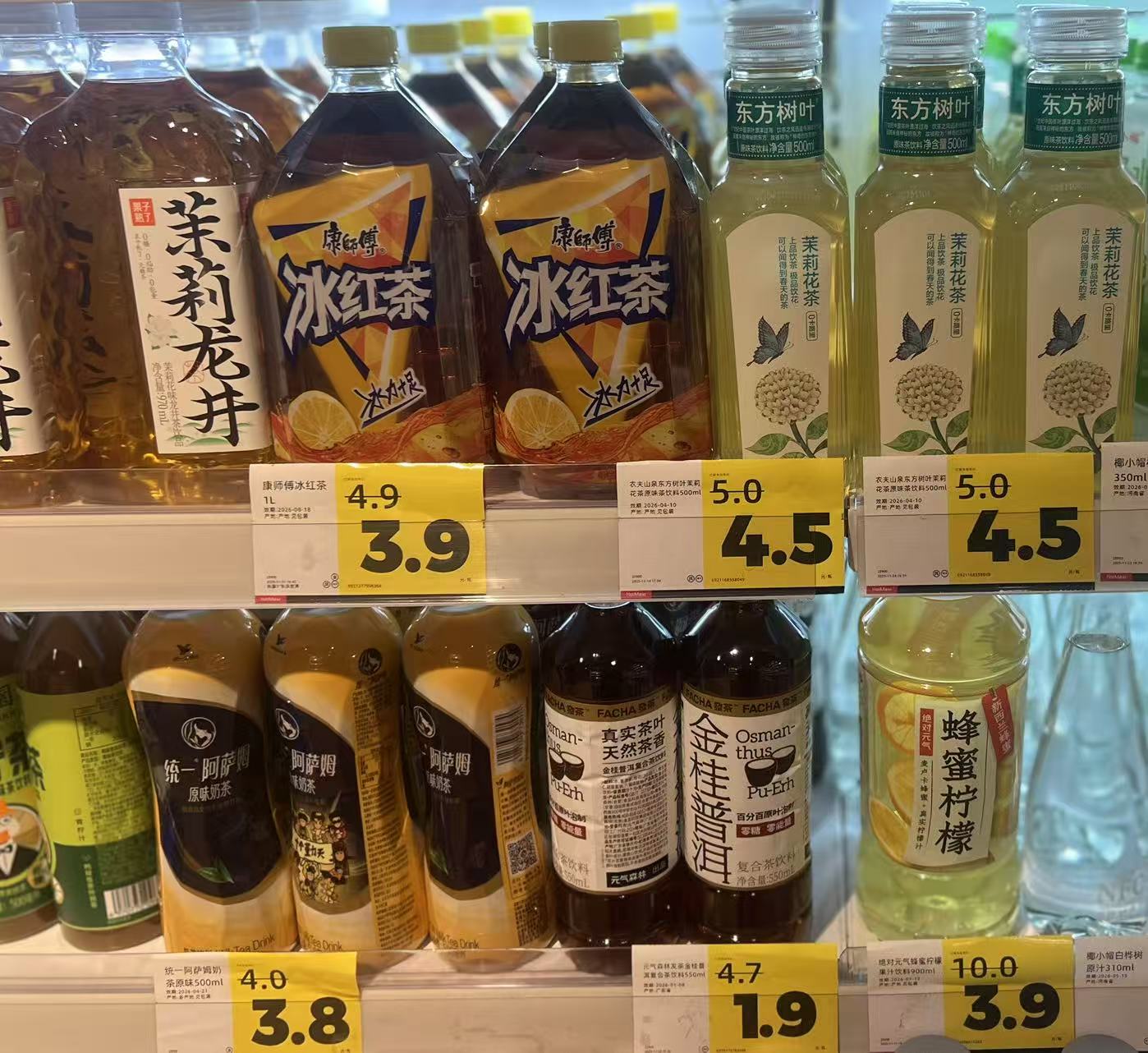 界面新聞走訪商超發(fā)現(xiàn),康師傅的無糖茉莉花茶500ml單瓶價格在4元左右,而茶的傳人500ml單價則在6元左右。茶的傳人與東方樹葉500ml定價持平,但東方樹葉無論是在鋪貨覆蓋范圍還是促銷強度上都要高于前者。