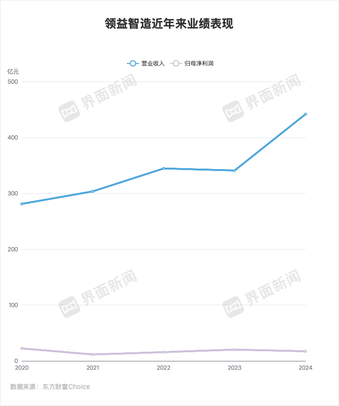 財務實力為其業(yè)務擴張?zhí)峁┝酥?/span>。2020-2024年間,領益智造營業(yè)收入保持穩(wěn)健增長,且歷年歸母凈利潤均維持在10億元以上的規(guī)模。