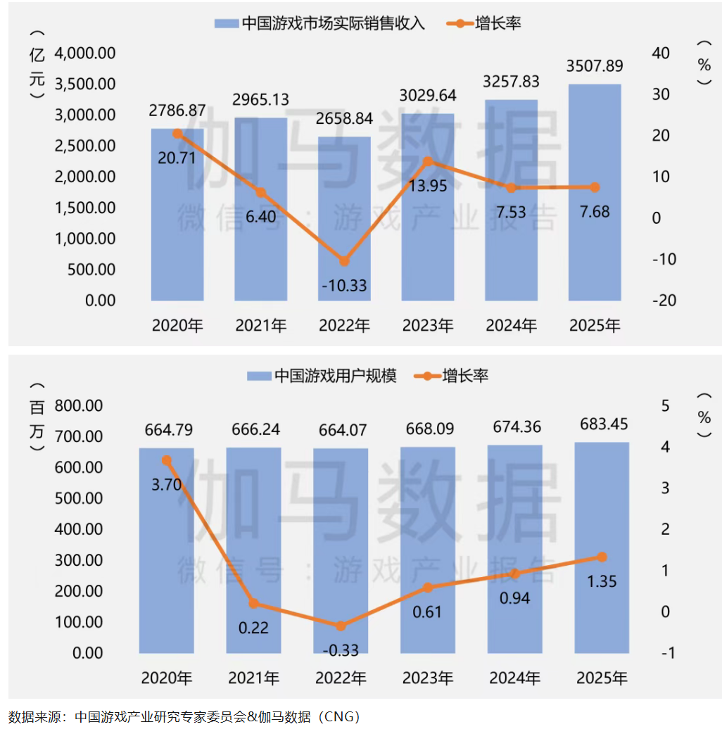 12月19日發(fā)布的《2025年中國游戲產(chǎn)業(yè)報(bào)告》卻給了出人意料的數(shù)據(jù):2025年,國內(nèi)游戲市場實(shí)際銷售收入3507.89億元,同比增長7.68%;用戶規(guī)模6.83億,同比增長1.35%。同為歷史新高點(diǎn)。