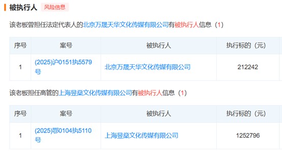 界面新聞記者進(jìn)一步核查發(fā)現(xiàn),天眼查平臺有兩條“劉凌爽”的查詢結(jié)果,兩人任職履歷中均出現(xiàn)“汐瑤”系公司,高度疑似為同一主體。該主體存明顯資金壓力信號:不僅出質(zhì)了北京汐瑤科技有限公司40%的股份,其關(guān)聯(lián)企業(yè)還密集陷入執(zhí)行糾紛。其中,他擔(dān)任法定代表人的北京萬晟天華文化傳媒有限公司(常以短劇出品方身份出現(xiàn)),于10月成為被執(zhí)行人,執(zhí)行標(biāo)的21.2萬元;他擔(dān)任高管的上海昱燊文化傳媒有限公司,于9月被列為被執(zhí)行人,執(zhí)行標(biāo)的125萬元。值得注意的是,上述兩起被執(zhí)行信息均發(fā)生在2025年,時間集中且距此次股權(quán)收購間隔極短。