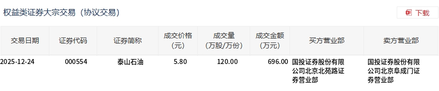 12月24日,泰山石油大宗交易成交120萬(wàn)股,成交額696萬(wàn)元,占當(dāng)日總成交額的10.36%,成交價(jià)5.8元,較市場(chǎng)收盤(pán)價(jià)6.5元折價(jià)10.77%。