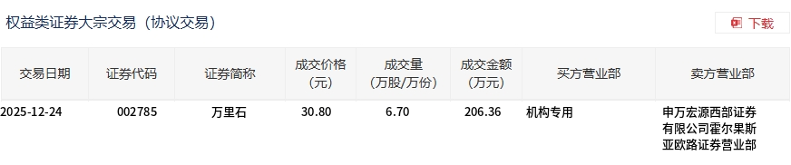 12月24日,萬(wàn)里石大宗交易成交6.7萬(wàn)股,成交額206.36萬(wàn)元,占當(dāng)日總成交額的1.02%,成交價(jià)30.8元,較市場(chǎng)收盤(pán)價(jià)33.84元折價(jià)8.98%。