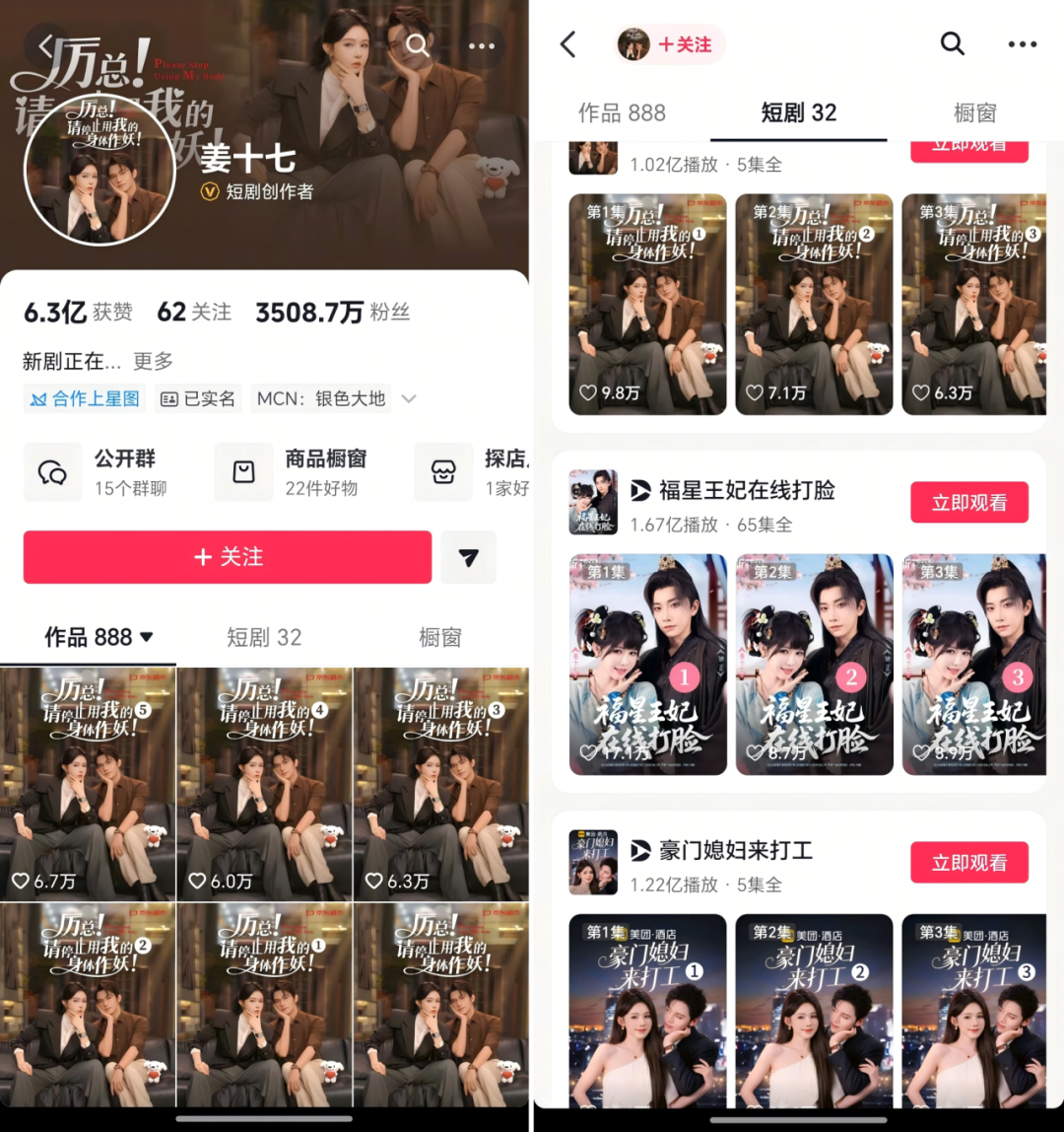 時(shí)機(jī)對(duì)于演員的重要性不言而喻,如今要盤點(diǎn)短劇女演員,不管從粉絲量、作品數(shù)量、爆款作品等幾個(gè)指標(biāo)看最紅火的都是出道最早的那批。比如憑借《惡女的告白》一炮而紅的姜十七,2019年就以劇情博主的身份活躍在抖音,如今已經(jīng)積累了3500多萬(wàn)粉絲,去年她有6部短劇進(jìn)入年度播放前十,在短劇界斷層第一。