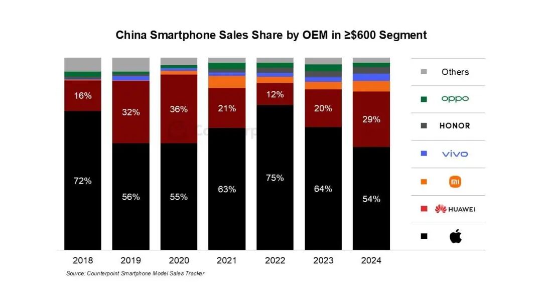 而在高端市場(chǎng),相比其他很多行業(yè),高端手機(jī)是少有至今格局依然未曾變大的賽道。2024年的機(jī)構(gòu)數(shù)據(jù)表明,4K以上旗艦機(jī)中,蘋(píng)果與華為占據(jù)了80%以上份額,預(yù)估2025年各廠商份額不會(huì)有太多改變。