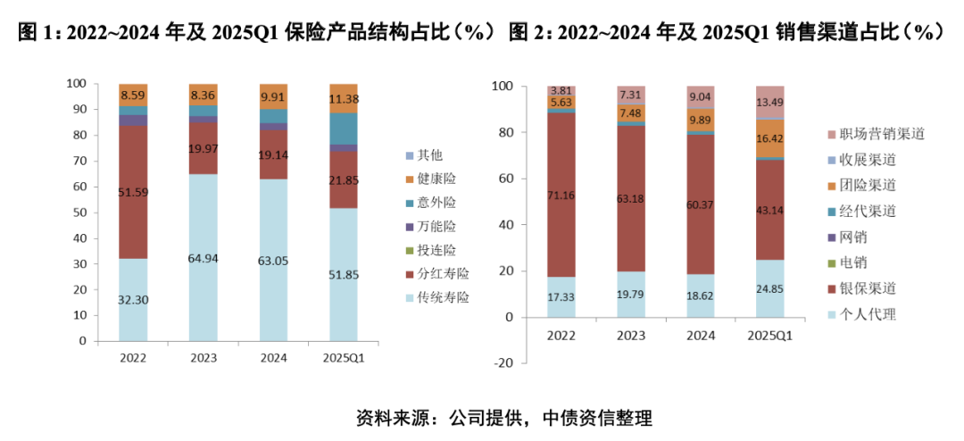 根據(jù)中債資信出具的跟蹤評(píng)級(jí)報(bào)告,2024年該公司銀保渠道規(guī)模保費(fèi)占比為60.37%,同比下降2.81個(gè)百分點(diǎn);個(gè)險(xiǎn)渠道占比為18.62%,同比下降1.17個(gè)百分點(diǎn);團(tuán)險(xiǎn)渠道、職場(chǎng)營(yíng)銷渠道占比分別為9.89%和9.04%,同比均有所提升,渠道結(jié)構(gòu)略有優(yōu)化。