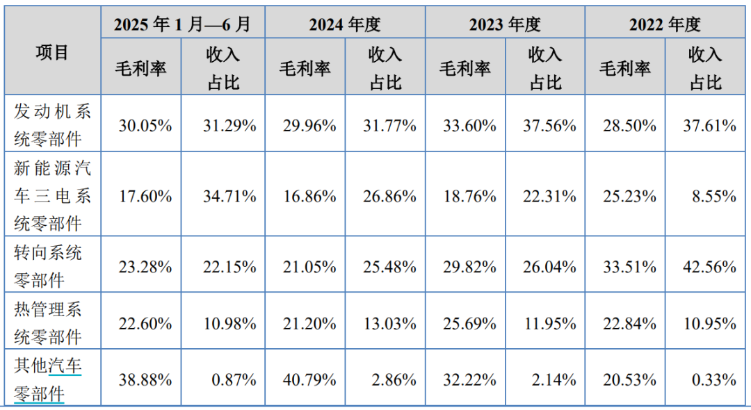 《招股書(shū)》顯示,隆源股份新能源汽車三電系統(tǒng)零部件產(chǎn)品的毛利率逐年下滑,2022年—2024年及2025年上半年分別為25.23%、18.76%、16.86%和17.6%,均低于公司發(fā)動(dòng)機(jī)系統(tǒng)零部件、轉(zhuǎn)向系統(tǒng)零部件等其他汽車類零部件產(chǎn)品的毛利率。對(duì)此,公司表示是由于市場(chǎng)競(jìng)爭(zhēng)較為激烈,產(chǎn)品生產(chǎn)工藝復(fù)雜。