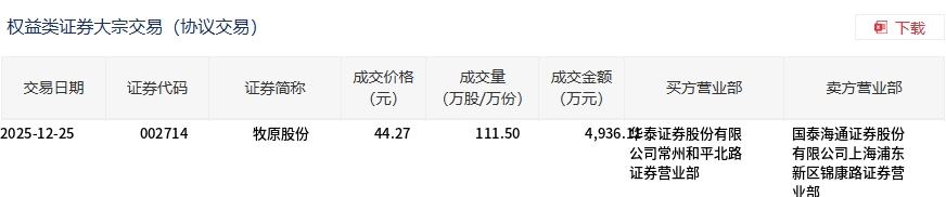 12月25日,牧原股份大宗交易成交111.5萬(wàn)股,成交額4936.11萬(wàn)元,占當(dāng)日總成交額的4.11%,成交價(jià)44.27元,較市場(chǎng)收盤(pán)價(jià)47.95元折價(jià)7.67%。