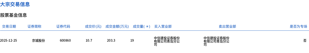 12月25日,京城股份大宗交易成交19萬股,成交額203.3萬元,占當(dāng)日總成交額的0.75%,成交價(jià)10.7元,較市場(chǎng)收盤價(jià)12.61元折價(jià)15.15%。