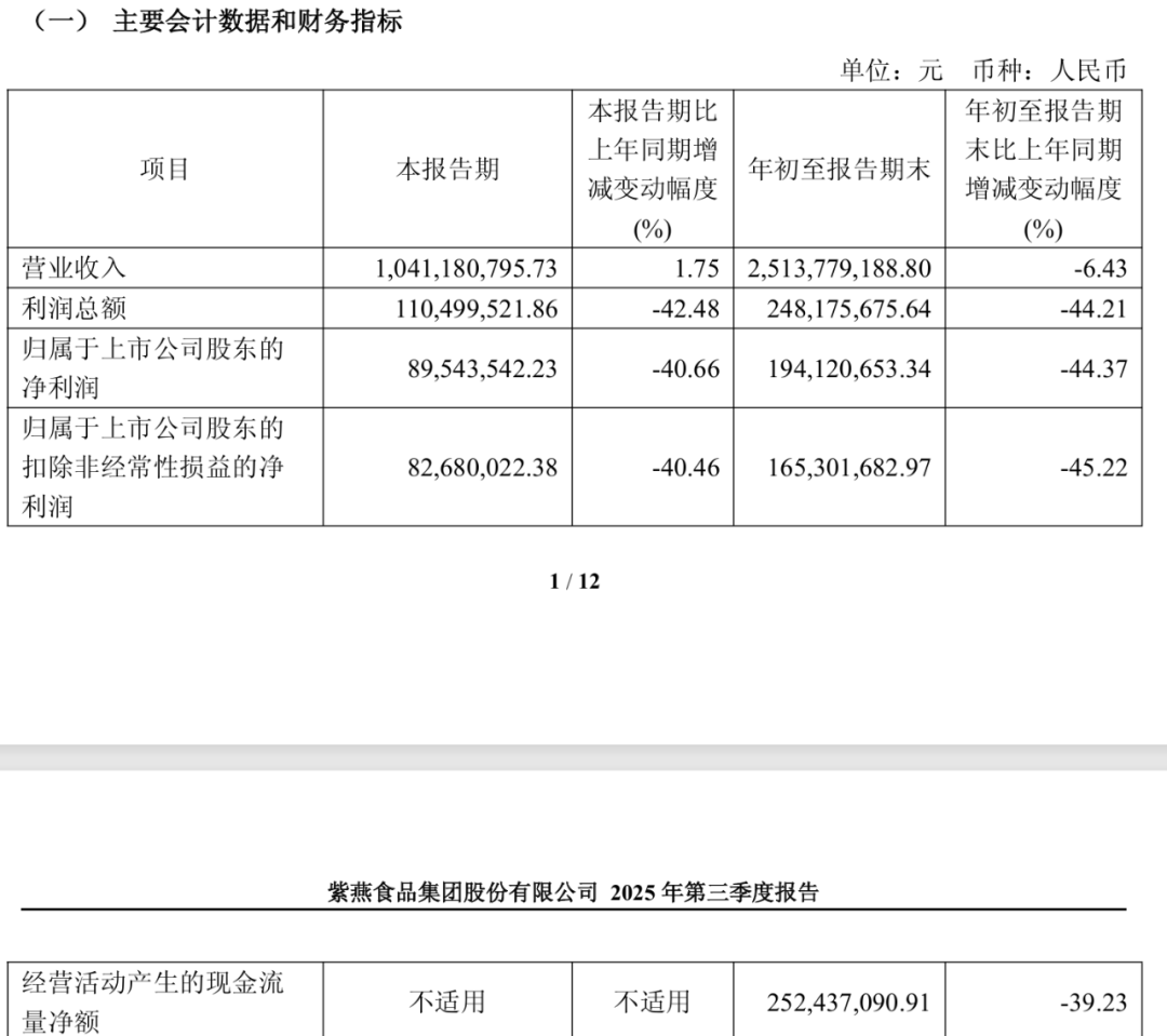 紫燕食品2025年三季報(bào)顯示,公司前三季營收約25.14億元,同比減少6.43%;歸母凈利潤約1.94億元,同比減少44.37%。經(jīng)營活動(dòng)產(chǎn)生的現(xiàn)金流凈額約2.52億元,同比減少39.23%。對(duì)于公司利潤總額同比減少超四成的原因,紫燕食品解釋為主要因業(yè)績下滑導(dǎo)致收入降低,毛利下降較多。對(duì)于現(xiàn)金流的大幅減少,則是因營收下降,導(dǎo)致銷售商品和提供勞務(wù)收到的現(xiàn)金有所下降。