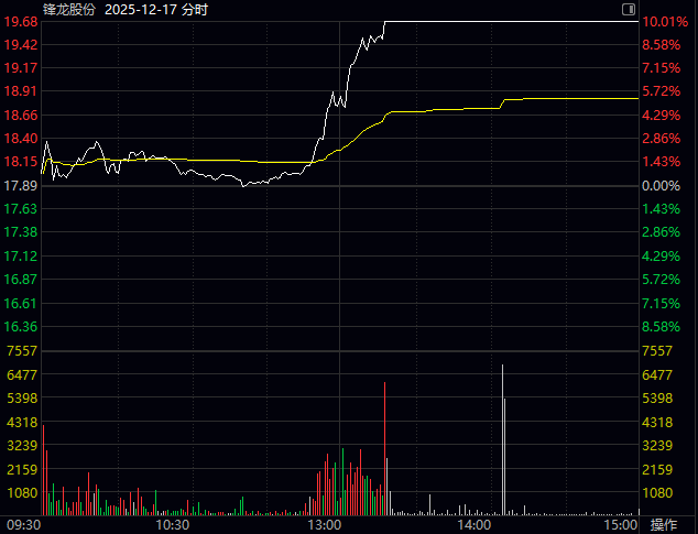 鋒龍股份在停牌前一個(gè)交易日,早盤(pán)大部分時(shí)間還在平盤(pán)線附近振蕩,11時(shí)15分左右突然拉伸,午盤(pán)開(kāi)盤(pán)后不久便漲停封板。