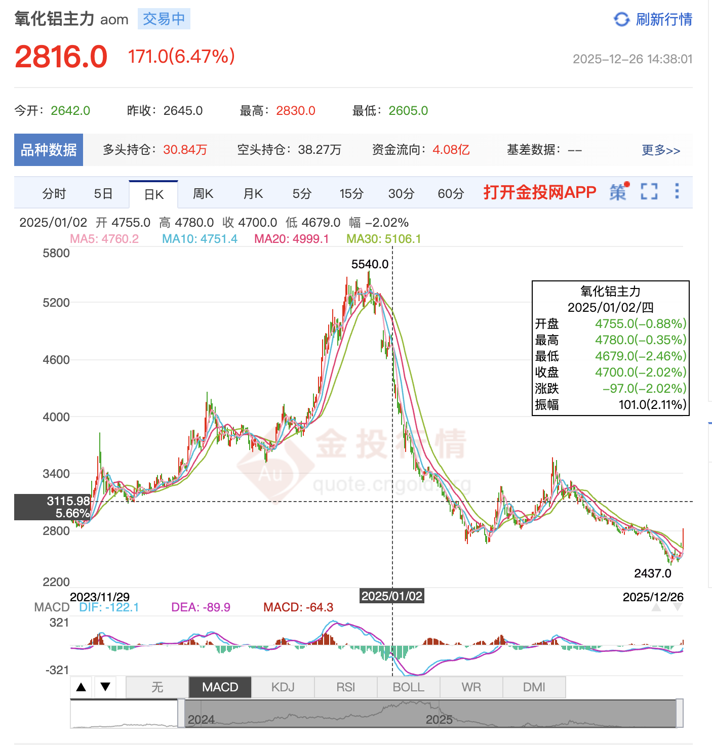 12月26日,氧化鋁主力合約一度逼近7%漲停,報(bào)2830元/噸。