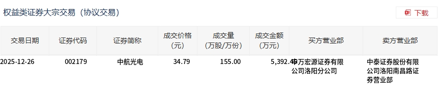 12月26日,中航光電大宗交易成交155萬(wàn)股,成交額5392.45萬(wàn)元,占當(dāng)日總成交額的3.21%,成交價(jià)34.79元,較市場(chǎng)收盤價(jià)34.79元持平。