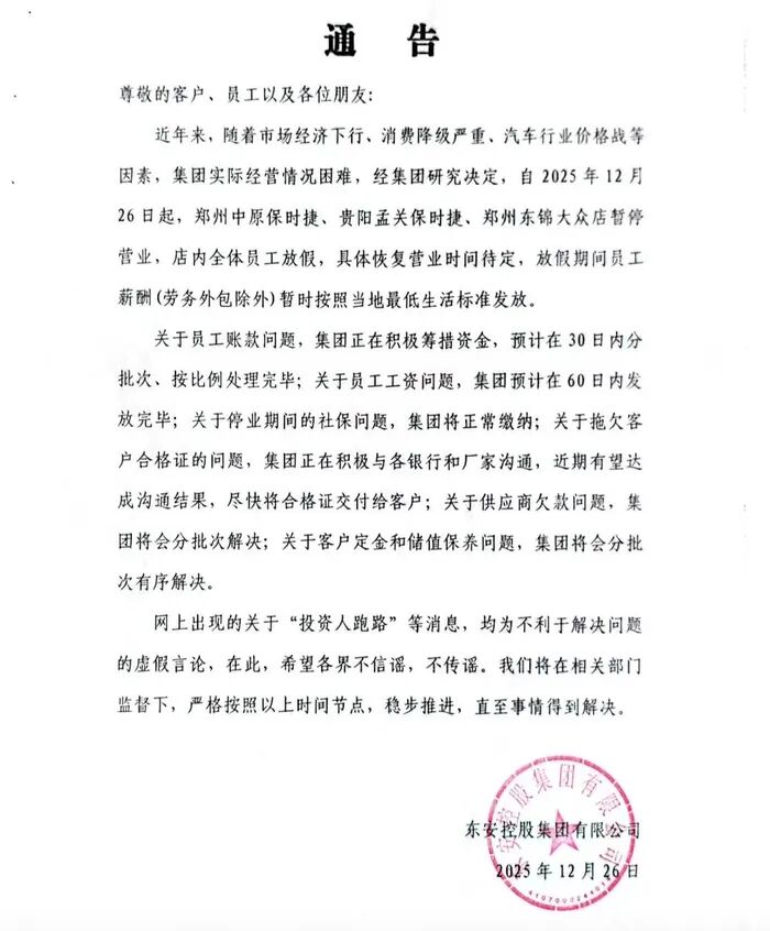 12月26日,東安集團發(fā)布通告稱,近年來,隨著市場經(jīng)濟下行,消費降級嚴重,汽車行業(yè)價格戰(zhàn)等因素,集團實際經(jīng)營情況困難,經(jīng)集團研究決定,自2025年12月26日起,鄭州中原保時捷、貴陽孟關(guān)保時捷、鄭州東錦大眾店暫停營業(yè),店內(nèi)全體員工放假,具體恢復(fù)營業(yè)時間待定,放假期間員工薪酬(勞務(wù)外包除外)暫時按照當?shù)刈畹蜕顦藴拾l(fā)放。