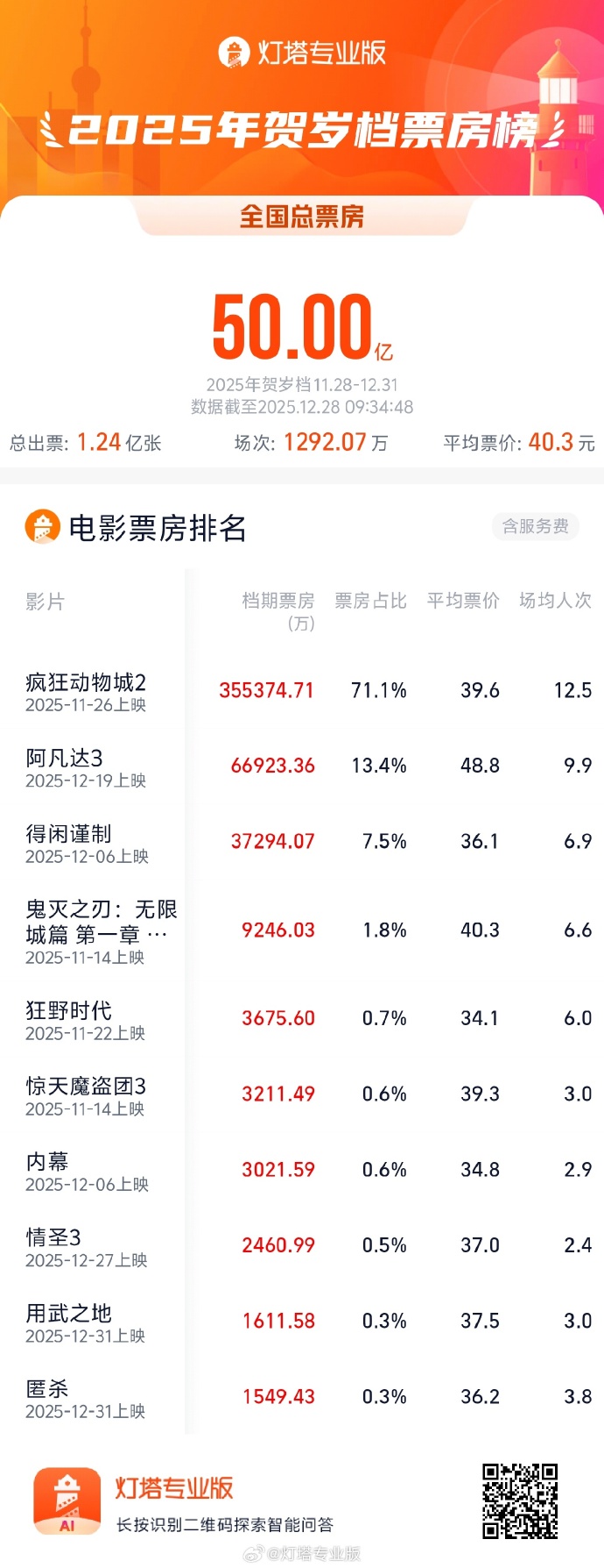 據燈塔專業(yè)版,截至12月28日9時34分,2025年賀歲檔(11月28日-12月31日)檔期總票房(含預售)突破50億。