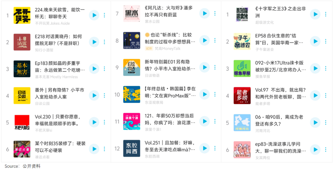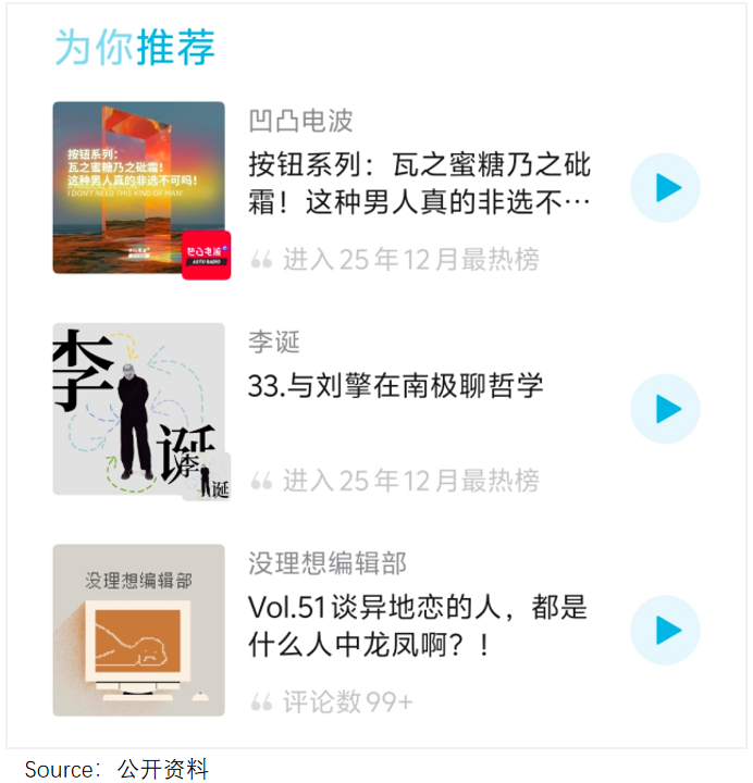 一旦這些強(qiáng)勢個(gè)人IP或?qū)I(yè)品牌空降,聽眾的注意力便會被瞬間虹吸——這一點(diǎn),從平臺推薦榜長期被少數(shù)熟悉面孔“霸榜”就可見一斑。