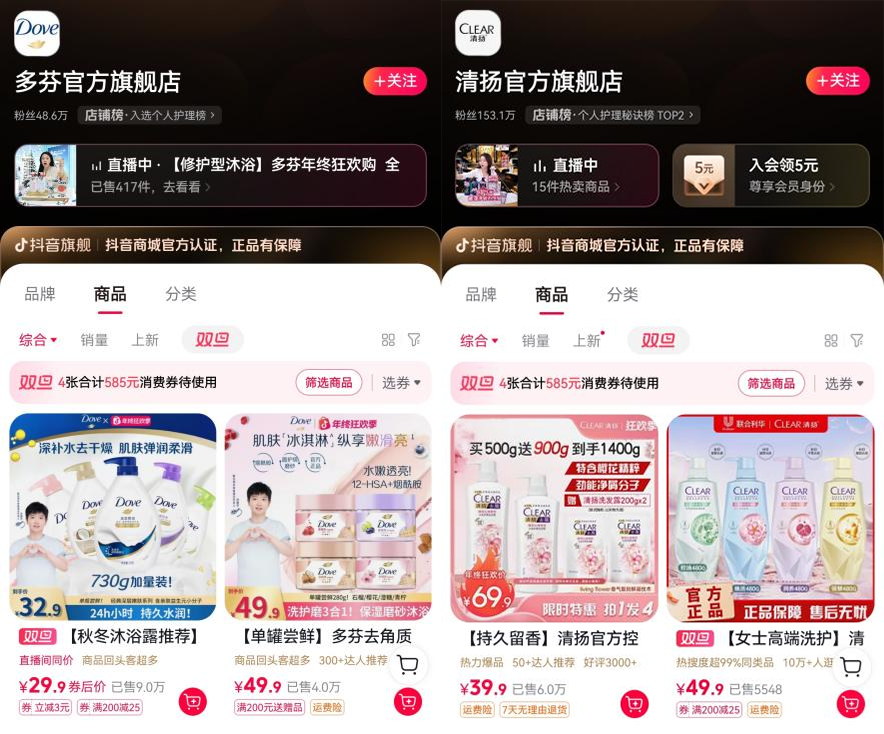聯(lián)合利華旗下多芬、清揚等品牌在抖音平臺的旗艦店