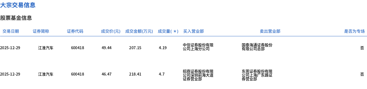 12月29日,江淮汽車(chē)大宗交易成交8.89萬(wàn)股,成交額425.56萬(wàn)元,占當(dāng)日總成交額的0.18%,成交均價(jià)47.87元,較市場(chǎng)收盤(pán)價(jià)49.44元折價(jià)3.18%,其中最高成交價(jià)49.44元,最低成交價(jià)46.47元。