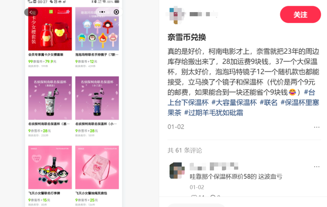 瑞幸也面臨著相似的輿情:大量消費(fèi)者反饋,瑞幸與《鬼滅之刃》聯(lián)動的冰箱貼與八杯套餐綁定,但僅在三天之后容量被瑞幸改為三杯。“前期斷貨,后期滯銷”的狀況頻發(fā),周邊清倉貶值的周期也越來越短,讓當(dāng)初砸下真金白銀的消費(fèi)者感到被背刺。
