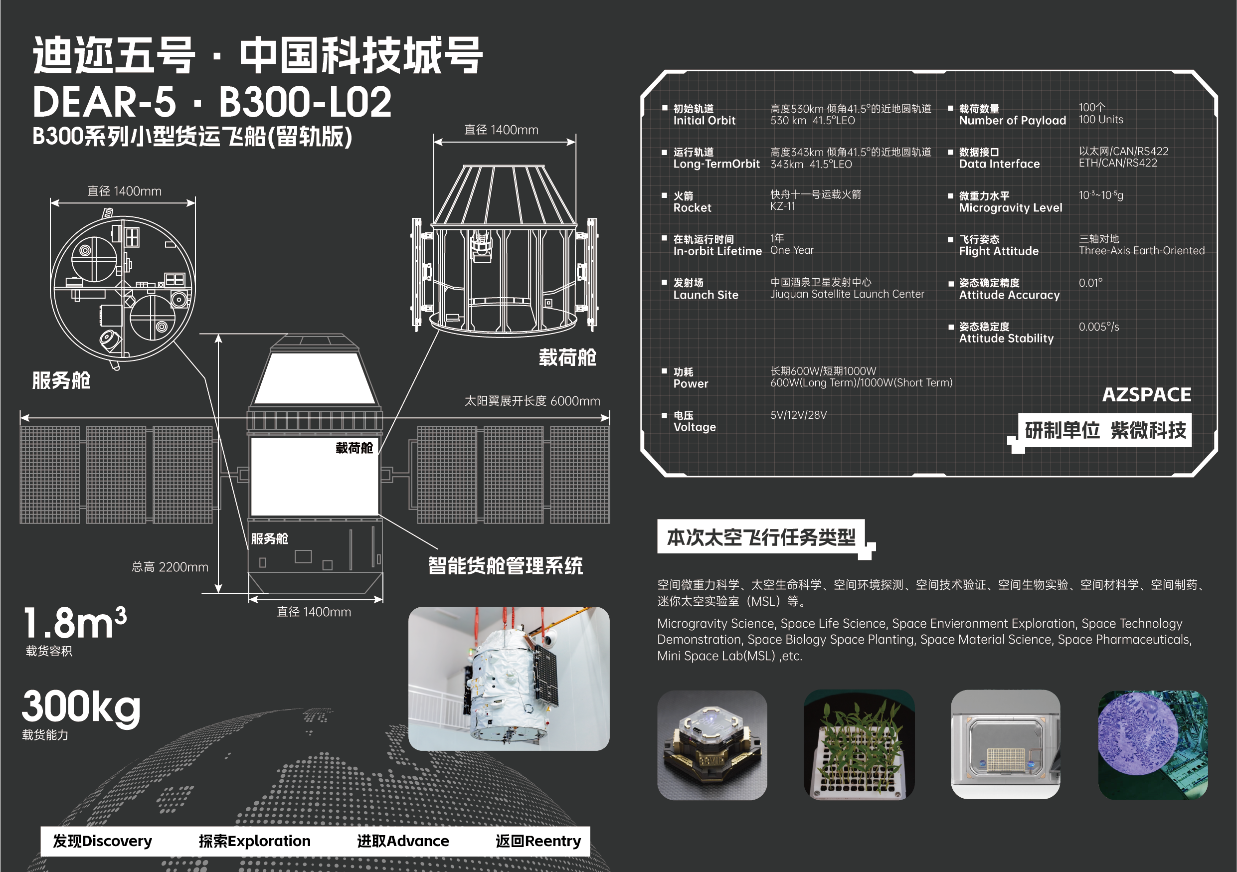 該飛船載荷承載能力300公斤載、有效容積1.8立方米,發(fā)射軌道高度530公里,長期運(yùn)營軌道434公里。此次搭載了科研機(jī)構(gòu)、高校、企業(yè)等的科學(xué)試驗(yàn)載荷,將開展為期一年的34項(xiàng)載荷相關(guān)試驗(yàn)和平臺任務(wù)。