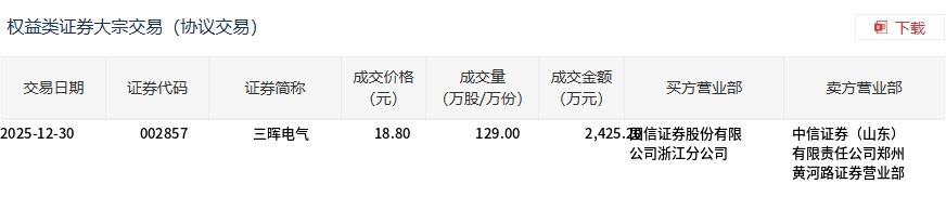 12月30日,三暉電氣大宗交易成交129萬股,成交額2425.2萬元,占當(dāng)日總成交額的38.77%,成交價(jià)18.8元,較市場收盤價(jià)20.53元折價(jià)8.43%。