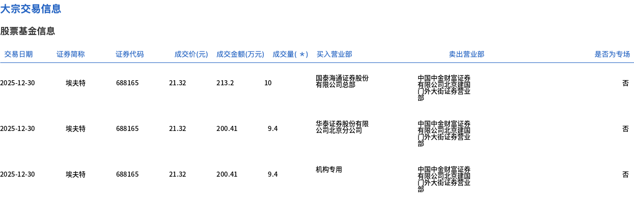 12月30日,埃夫特大宗交易成交28.8萬股,成交額614.02萬元,占當(dāng)日總成交額的0.81%,成交價(jià)21.32元,較市場(chǎng)收盤價(jià)24.58元折價(jià)13.26%。