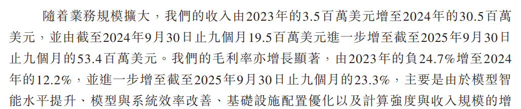 更關(guān)鍵的“底線指標(biāo)——毛利率,反映出其成本控制能力的提升。MiniMax披露,MiniMax毛利率由2023年的-24.7%,扭轉(zhuǎn)為2024年的12.2%,升至截至2025年前三季度23.3%,呈現(xiàn)出持續(xù)改善的趨勢。