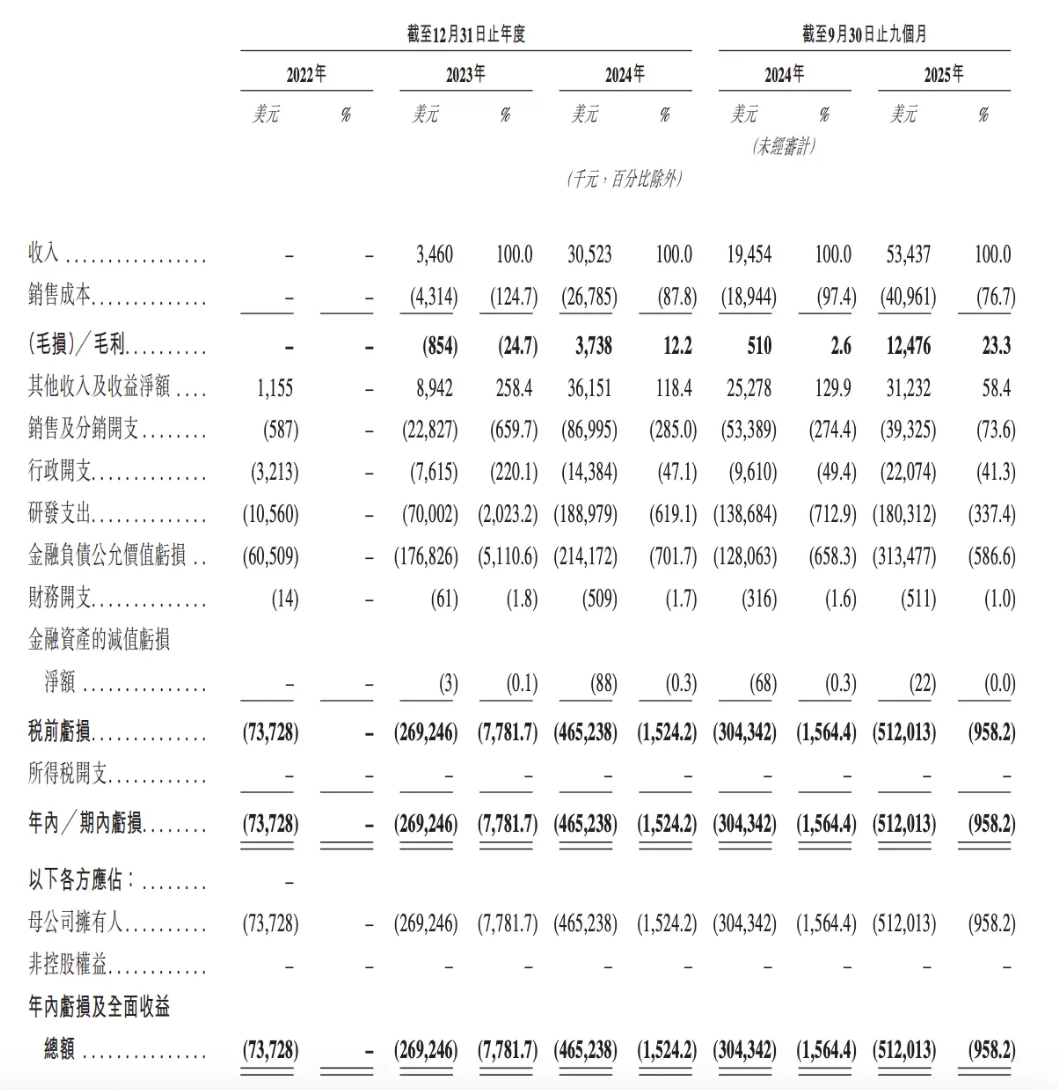 不過虧損額雖然在持續(xù)擴(kuò)大,但虧損幅度不斷收窄,整體釋放出積極信號(hào)。2023年虧損約為當(dāng)年收入的78倍,2024年降至15倍。到了2025年前三季度,虧損僅為收入的9倍,凈虧損同比下降63.26%。更能反映業(yè)務(wù)核心表現(xiàn)的經(jīng)調(diào)整凈虧損(Non-IFRS),截至2025年9月30日僅有1.86億美元。