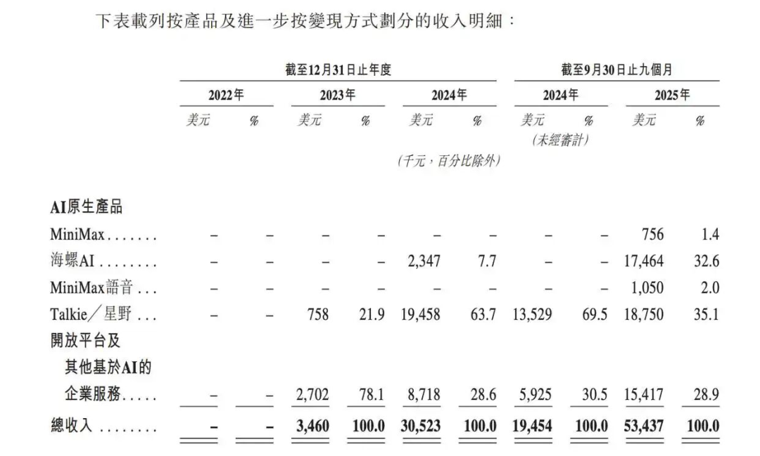 MiniMax AI原生產(chǎn)品營收情況,圖/MiniMax招股書