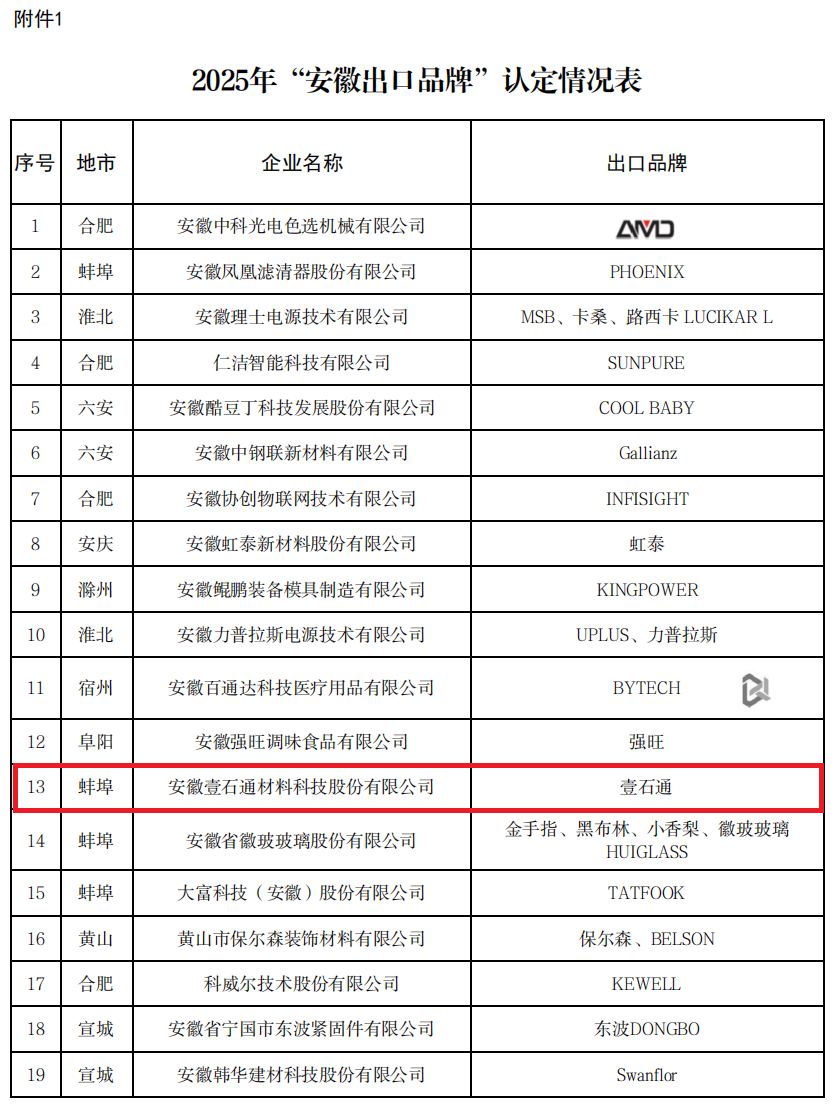 日前,安徽省商務(wù)廳發(fā)布2025年度“安徽出口品牌”認(rèn)定名單,懷遠(yuǎn)縣安徽壹石通材料科技股份有限公司光榮上榜。至此,懷遠(yuǎn)擁有省級出口品牌企業(yè)已達(dá)3家,分別為菲雷克斯、銀銳、壹石通。