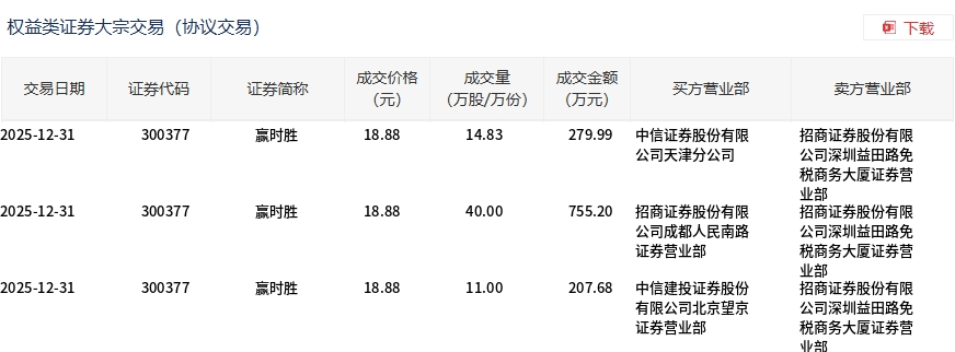 12月31日,贏時(shí)勝大宗交易成交65.83萬(wàn)股,成交額1242.87萬(wàn)元,占當(dāng)日總成交額的0.58%,成交價(jià)18.88元,較市場(chǎng)收盤(pán)價(jià)22.55元折價(jià)16.27%。