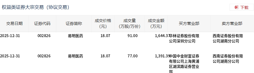 12月31日,易明醫(yī)藥大宗交易成交168萬(wàn)股,成交額3035.76萬(wàn)元,占當(dāng)日總成交額的25.42%,成交價(jià)18.07元,較市場(chǎng)收盤(pán)價(jià)18.38元折價(jià)1.69%。