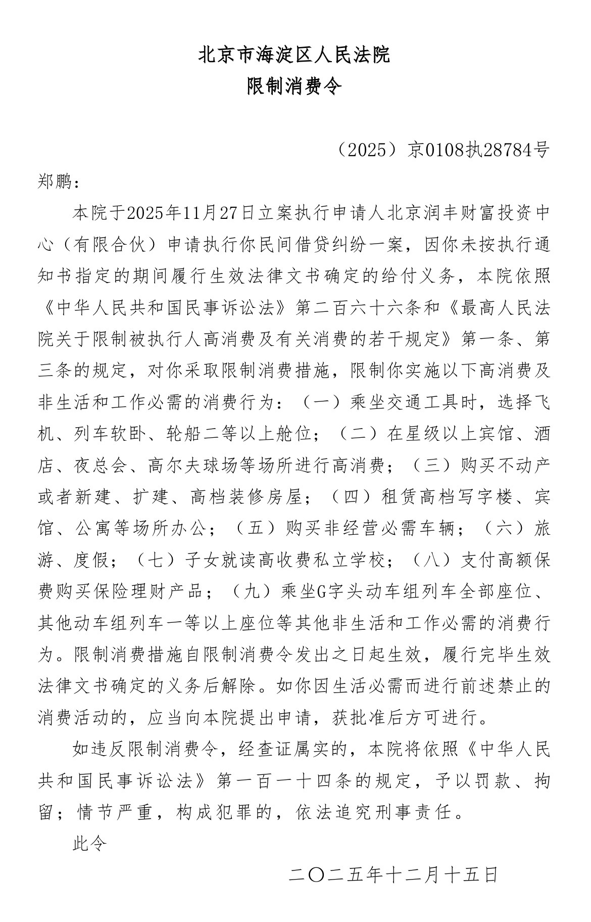 公開信息顯示,2025年11月27日,北京市海淀區(qū)人民法院已正式立案執(zhí)行申請(qǐng)人北京潤豐財(cái)富投資中心(有限合伙)申請(qǐng)執(zhí)行鄭鵬民間借貸糾紛一案。根據(jù)限制消費(fèi)令內(nèi)容,鄭鵬被明確限制實(shí)施九類消費(fèi)行為,具體包括:乘坐交通工具時(shí)選擇飛機(jī)、列車軟臥、輪船二等以上艙位及G字頭動(dòng)車組列車全部座位、其他動(dòng)車組列車一等以上座位;在星級(jí)以上賓館、酒店、夜總會(huì)、高爾夫球場(chǎng)等場(chǎng)所進(jìn)行高消費(fèi);購買不動(dòng)產(chǎn)、新建、擴(kuò)建或高檔裝修房屋;租賃高檔寫字樓、賓館、公寓等場(chǎng)所辦公;購買非經(jīng)營必需車輛;旅游、度假;讓子女就讀高收費(fèi)私立學(xué)校;支付高額保費(fèi)購買保險(xiǎn)理財(cái)產(chǎn)品,以及其他非生活和工作必需的消費(fèi)行為。