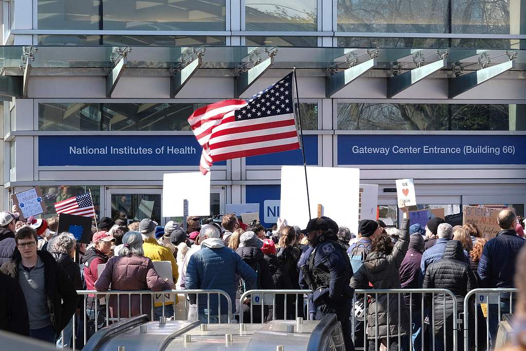 當(dāng)?shù)貢r(shí)間2025年3月8日,美國馬里蘭州,示威者在美國國立衛(wèi)生院外抗議削減資金 圖源:視覺中國