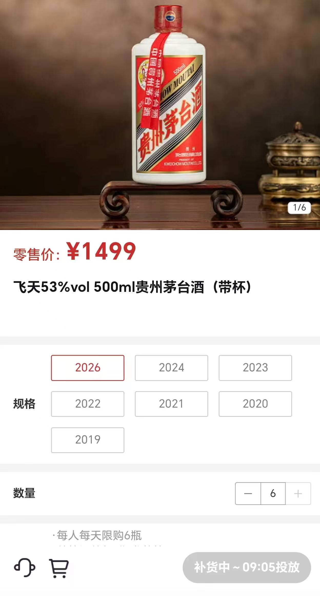 界面新聞從i茅臺(tái)APP獲悉,1月4日9點(diǎn)整,飛天53%vol 500ml貴州茅臺(tái)酒(2026)正式開放購買后,便出現(xiàn)“補(bǔ)貨中”字樣。